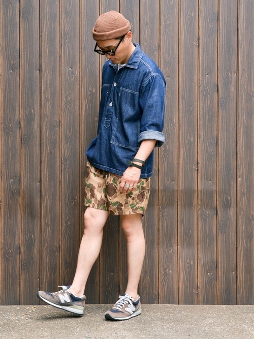 キャップと靴もショーツと同系色で、アイテム同士がケンカせず、きれいにまとまっていますね。上半身をデニムシャツ、眼鏡、キャップでキレイ目にまとめることによって、ラフさを抑えています。春から夏にかけて長く使えるコーデですね。