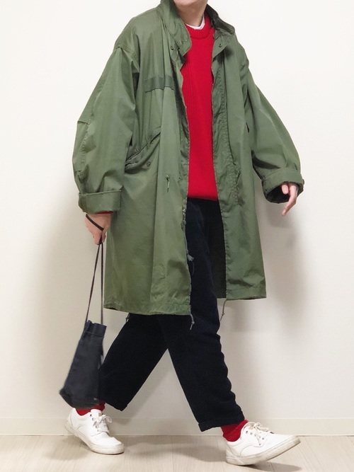 赤主体のキレイめモッズコートコーデ