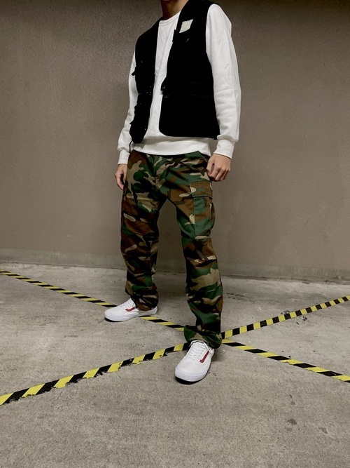 こちらはカモフラ柄のパンツを使ったコーデです。膨張色のトップスにカモフラ柄のパンツをあわせると、全体的にダボっとしたシルエットになってしまいますが、そこに黒のベストを合わせることで引きしまったコーデになっています。