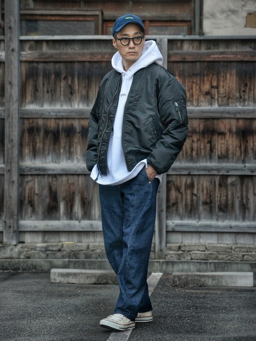 冬のアウターコーデです。こちらはショートアウターとしてMA-1をチョイスしています。中にパーカーを着込んだ着こなし方で、防寒もばっちりです。