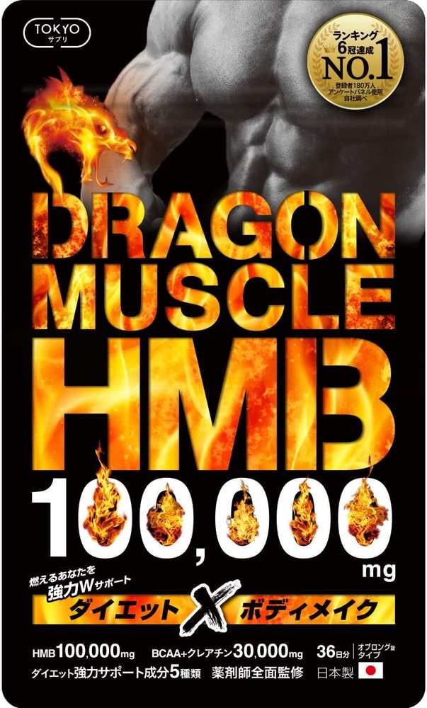 ドラゴンマッスルHMBは、減量とボディーメイクを強力にサポートするサプリメントです。HMB100000mg、クレアチン&BCAA30000mgと豊富に含まれた成分が、理想のボディーづくりをサポートします。さらに、L-カルニチン・サラシア・ギムネマなどの糖質や炭水化物の吸収を抑える成分が配合されており、減量・ダイエットにも効果的です。