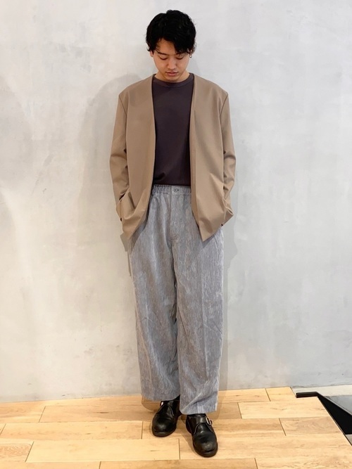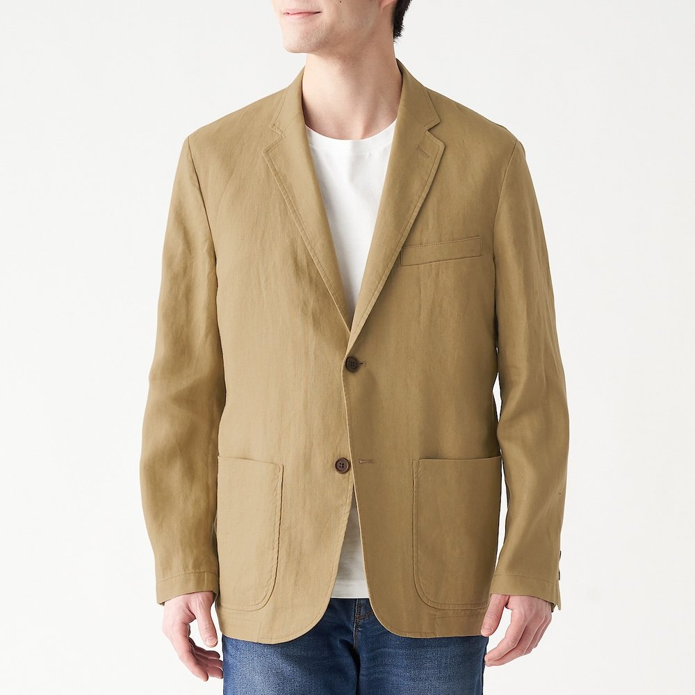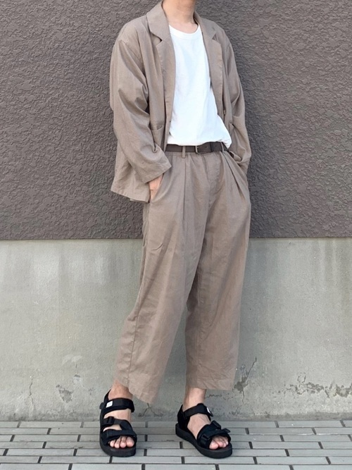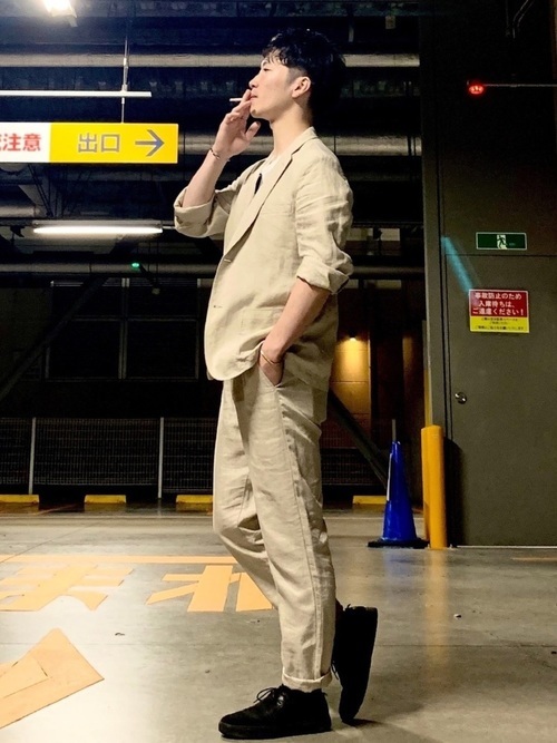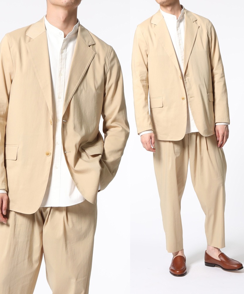 ベージュジャケットならリネン素材もおすすめです。夏に適した素材なので、少しゆったりめのシルエットで風通しの良さを強調して着こなしましょう。トレンドのワイドパンツやハーフパンツとの相性も抜群です!夏のビジネスファッションも涼しくサポートします。