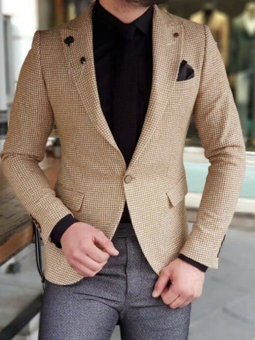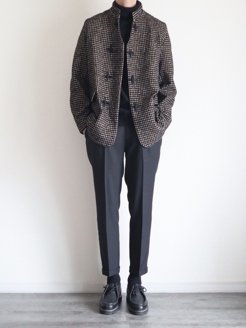 ツイードのベージュジャケットと黒のスラックスパンツを合わせた冬のメンズジャケパンコーデです。チャイナ服のようなデザインで暗めのベージュジャケットと、他のアイテムはすべて黒でまとめています。