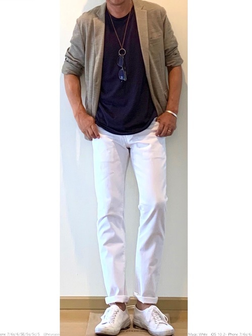 白いシューズを合わせるとより明るい雰囲気になります。こちらもインナーとシューズの色や明度を合わせているので統一感のあるコーデになっていますね。白シャツにあえてスニーカーを合わせ、こなれ感のあるおしゃれな仕上がりです。
