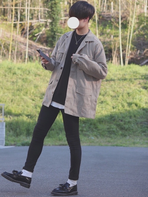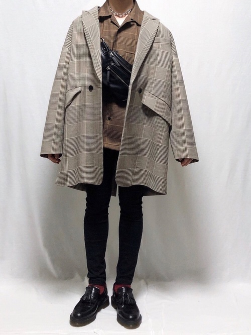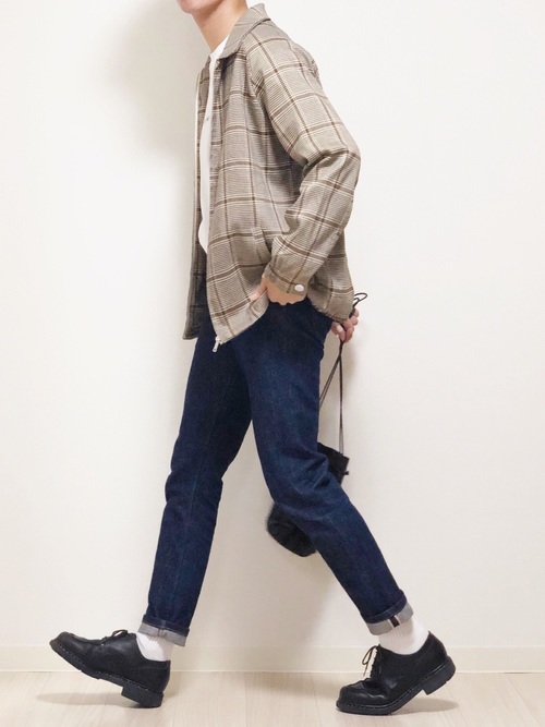 チェック柄のベージュジャケットとチェック柄シャツを合わせた秋のメンズジャケパンコーデです。ロングジャケットなのでコートのようにも使用でき、細身のパンツを合わせることでバランスの良い着こなしになっています。