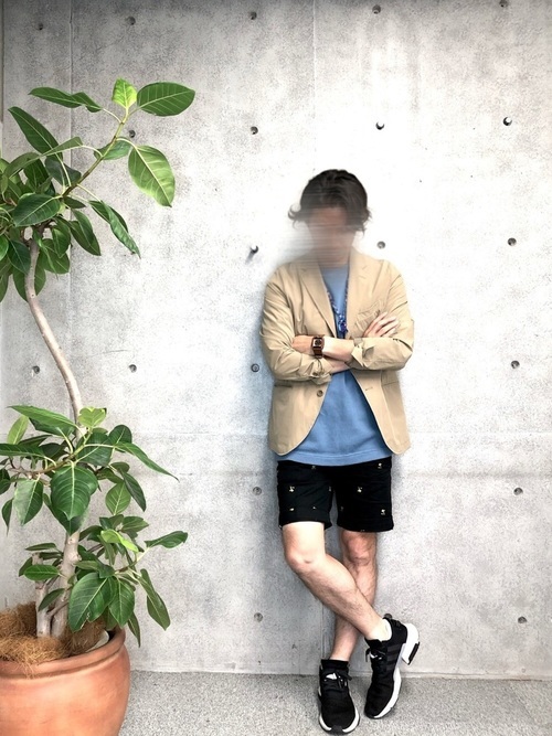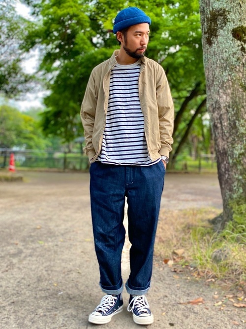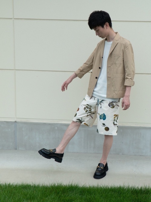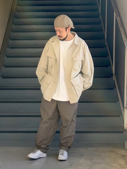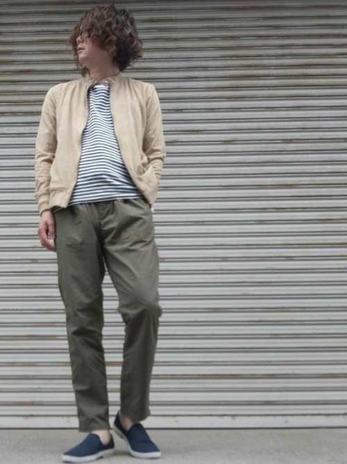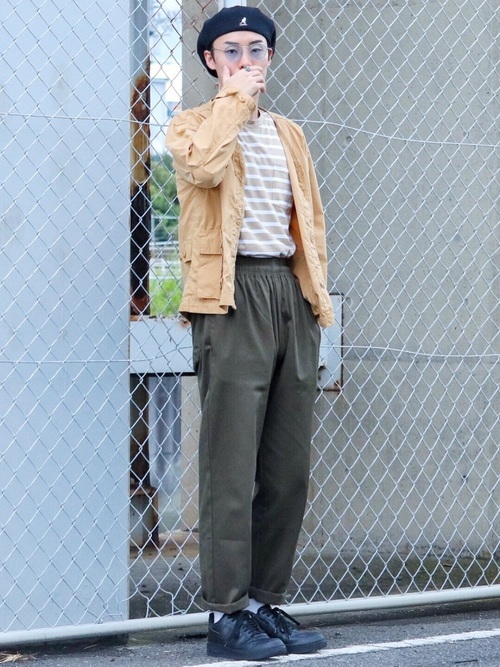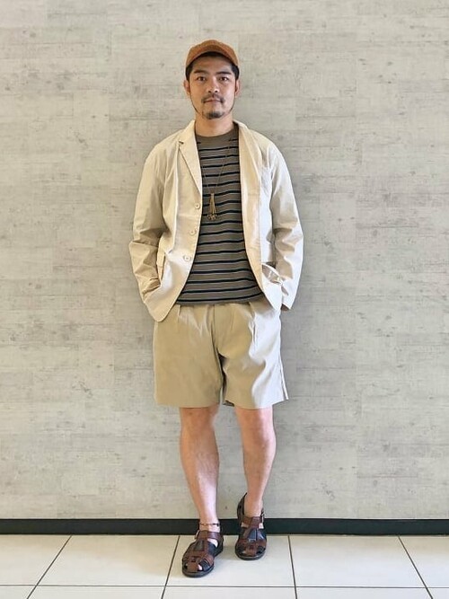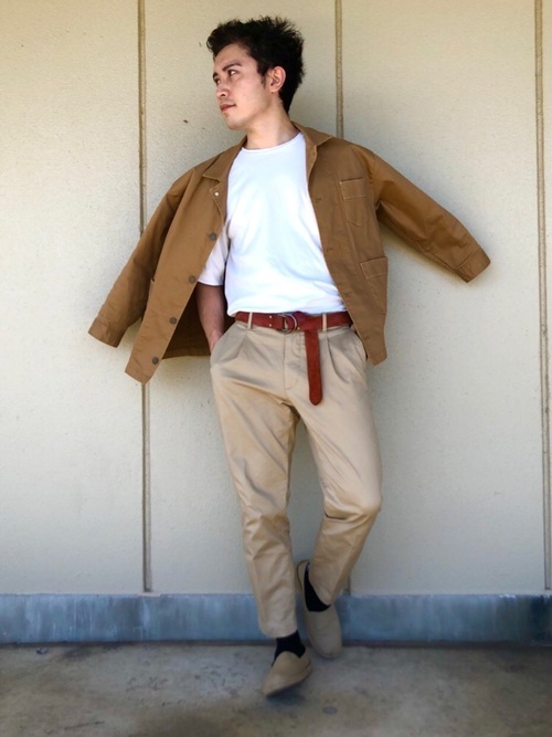 ベージュジャケットにカーキのパンツを合わせるとミリタリー感のあるジャケパンコーデになります。夏はハーフパンツを合わせても良いですね。黒は使わず締め色にもアースカラーを使用することで、統一感のある着こなしになります。