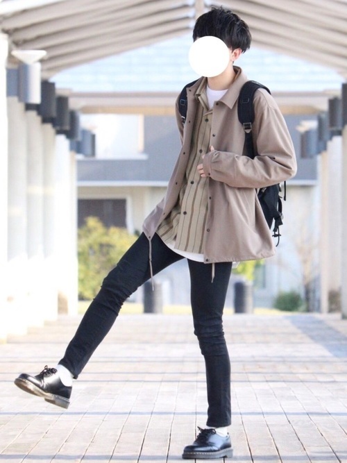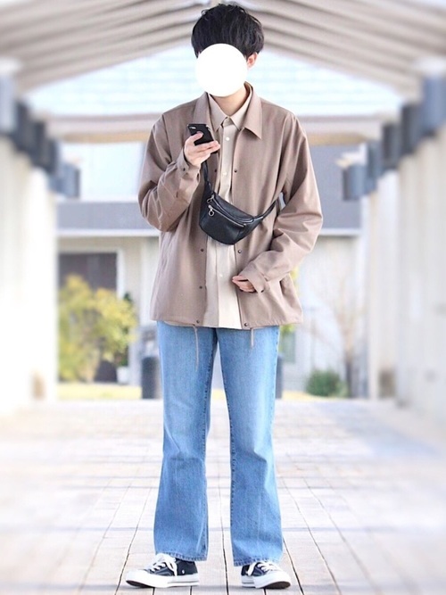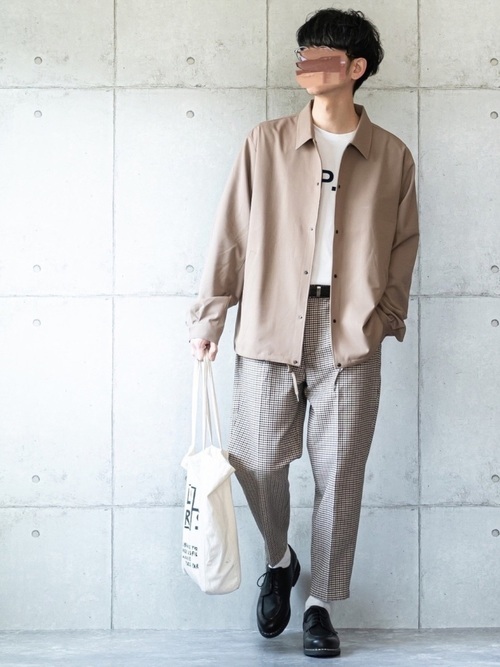 トレンドのコーチジャケットにもベージュを取り入れると、ストリート感もありながら清潔感のある着こなしができます。着丈を短めに作られているので、インナーをのぞかせてもおしゃれですね。光沢の少ない生地で着こなしやすいコーチジャケットです。