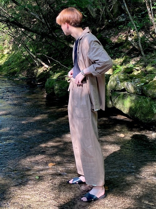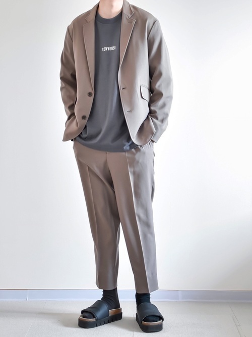 くすんだベージュのセットアップを着用した春のメンズコーデです。インナーのグレーTシャツもくすんだ色味なのでまとまりのある着こなしになっていますね。くすんだ色味と足もとのサンダルから春らしさを感じます。