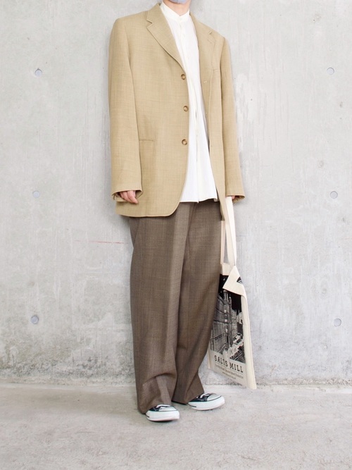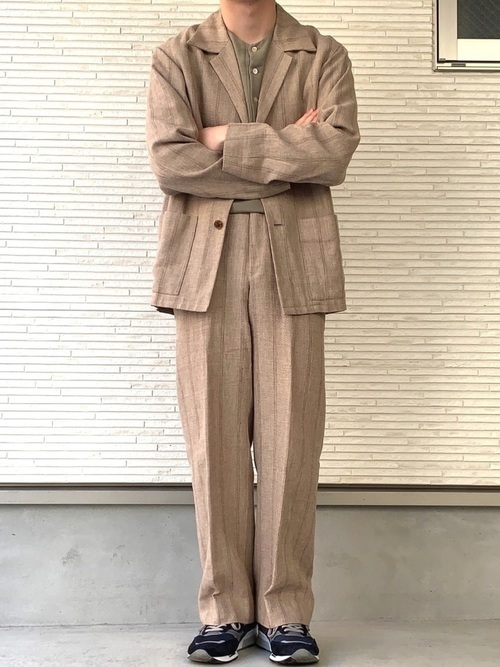 ③ベージュセットアップ×ヘンリーネックTシャツ
