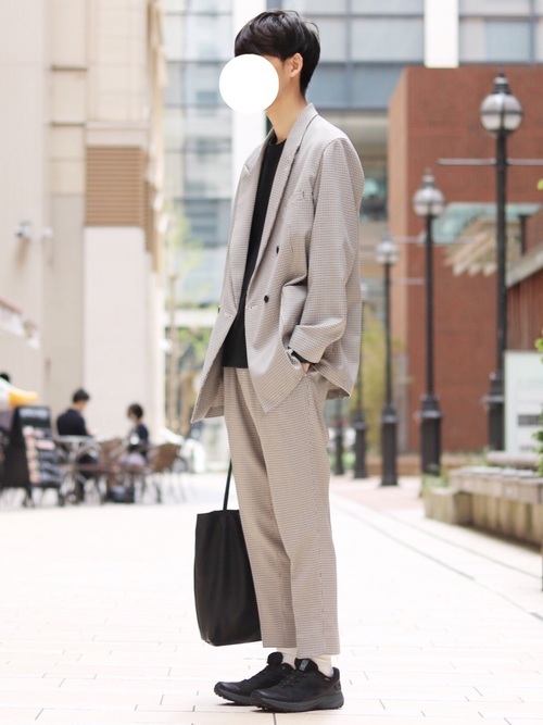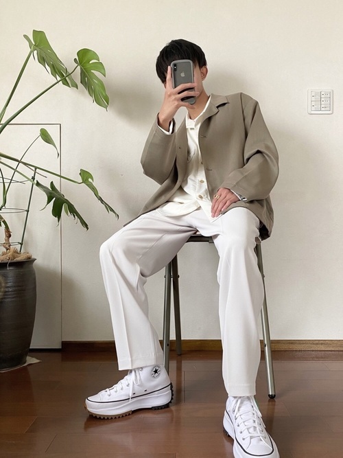 ベージュジャケットのコーデで悩みがちなのが、シューズに何色を合わせれば良いのかということですね。シューズもインナーやパンツと同じように、白・黒・グレーのモノトーンカラーのアイテムでOK。インナーにもシューズに近い色をを入れるとまとまりのあるコーデになります。