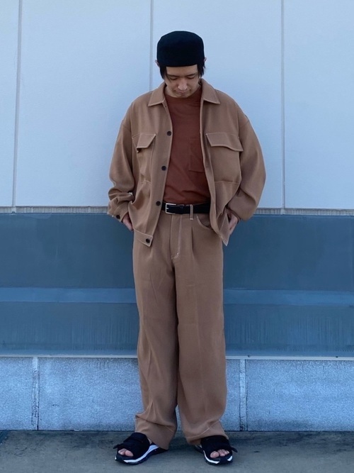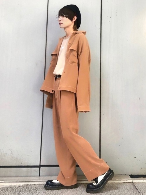 ベージュにも濃淡があり、それぞれに違った印象があります。上下をベージュで揃える時にも淡い色・濃い色で差をつけると、同じベージュでもコントラストがうまれてより自然な着こなしになります。紅葉のような色味で暖かみがあるので、秋冬に最適なコーデです。