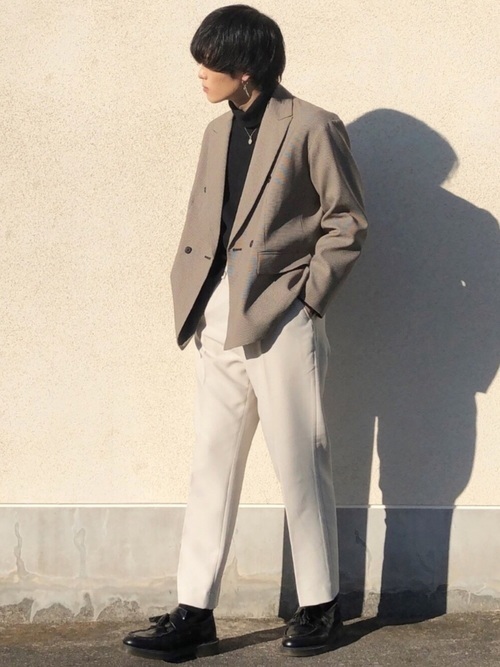 ベージュジャケットと白いパンツを着用した秋のメンズジャケパンコーデです。厚みのある生地とインナーのタートルネックニットで、白いパンツでも季節を感じる着こなしになっています。