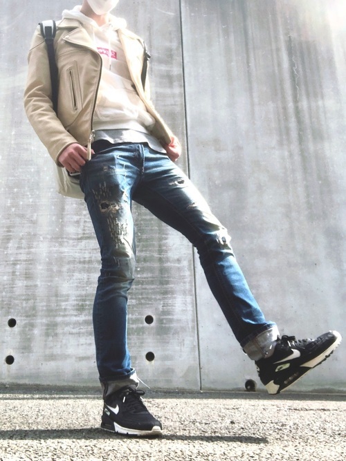 ライダースタイプのベージュジャケットと白いパーカー、ブルーのダメージデニムパンツを合わせた冬のメンズコーデです。ライダースジャケットもベージュだと上品なイメージがありますね。インナーに暖かいパーカーを着ていれば冬でも安心して過ごせますね。