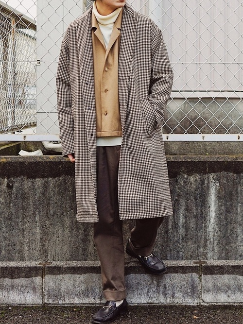 ベージュジャケットの上にガンクラブチェック柄のチェスターコートを合わせた冬のメンズコーデです。冬にはベージュジャケットの上にコートを羽織る着こなしもありますね。インナーの白いタートルネックニットが明るさをプラスして、冬のデートに着て欲しい女子ウケの良いコーデです。