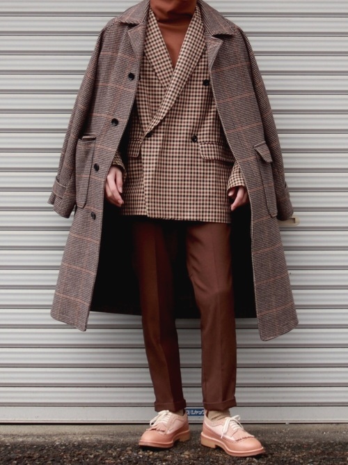 チェック柄ベージュジャケットとチェック柄ステンカラーコートを合わせた冬のメンズジャケパンコーデです。インナーとパンツをブラウンに揃え、黒を使わずに落ち着きのある着こなしを作っています。ピンクがかったベージュのシューズがアクセントになっておしゃれです。