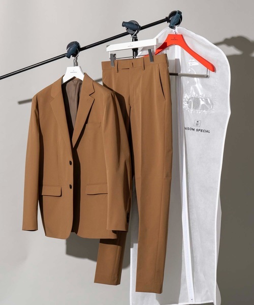 ベージュジャケットとベージュパンツのセットアップです。ストレッチ性のある素材で動きやすく、シワにならず撥水性もあるという機能面も兼ね揃っています。ビジネスシーンにもおすすめで、ネットに入れれば自宅でも洗濯できるのも嬉しいポイントです。