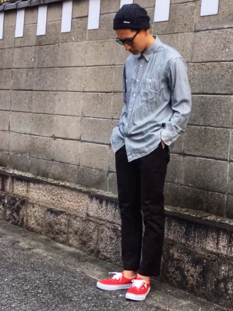 グレーのシャツに黒チノパンを合わせた、カジュアルなメンズコーデです。細身シルエットの黒チノパンなら、サラリとシャツ1枚で着こなすだけでおしゃれな印象に。地味に見えないようにメガネやキャップなど、小物類もうまく取り入れていることもポイントです。差し色の赤スニーカーが、モノクロコーデにメリハリを加えています。