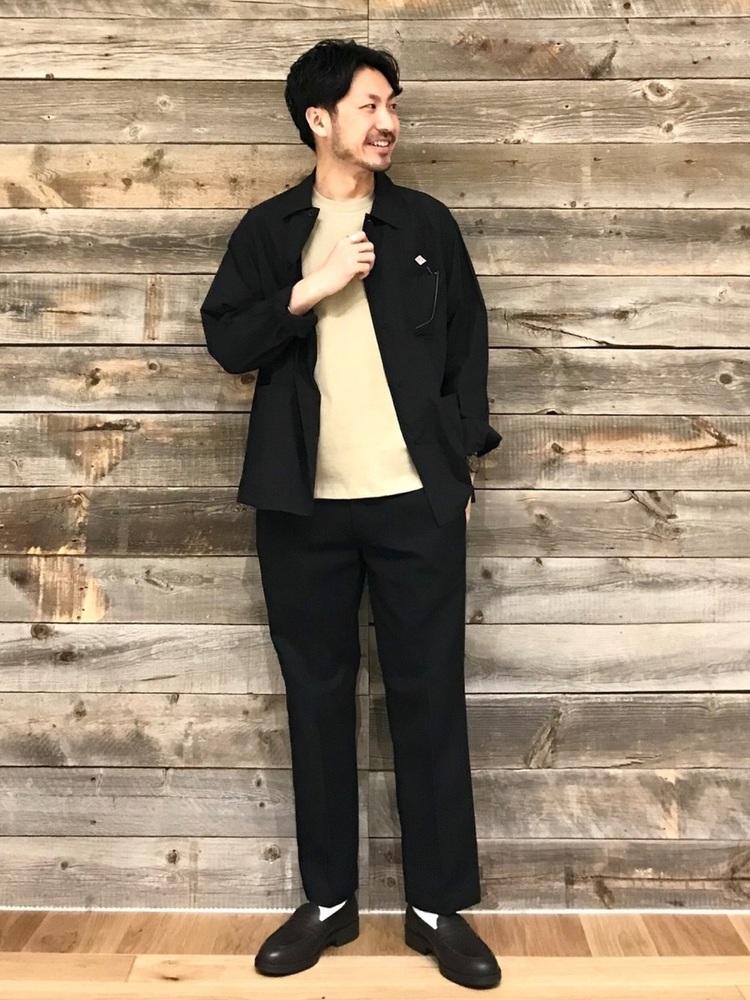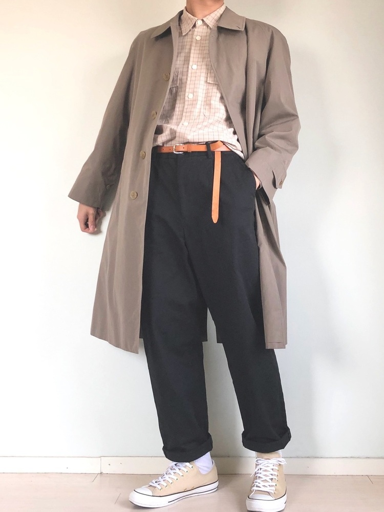 淡いベージュトーンでまとめたコーデを、黒チノパンで引き締めた大人のメンズコーデです。トップスのシャツはタックインし、ベルトでウエストマークを作ることで野暮ったく見えません。黒チノパンの裾は足首が見えるようにロールアップされているため、タックインと合わせれば脚長に見せています。春先にもオススメの着こなしです。