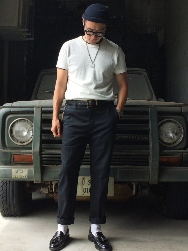 シンプルなのに大人っぽい雰囲気に仕上がる理由はコーデ全体をモノクロで統一し、かつシューズをローファーにした点です。ロールアップした細身の黒チノパンから覗くソックスは、トップスと同じ白にし、重たく見えがちな足元にクリーンな印象をプラス。Tシャツもなるべくコンパクトなシルエットを選び、タックインして腰回りをもたつかせないように着こなしています。