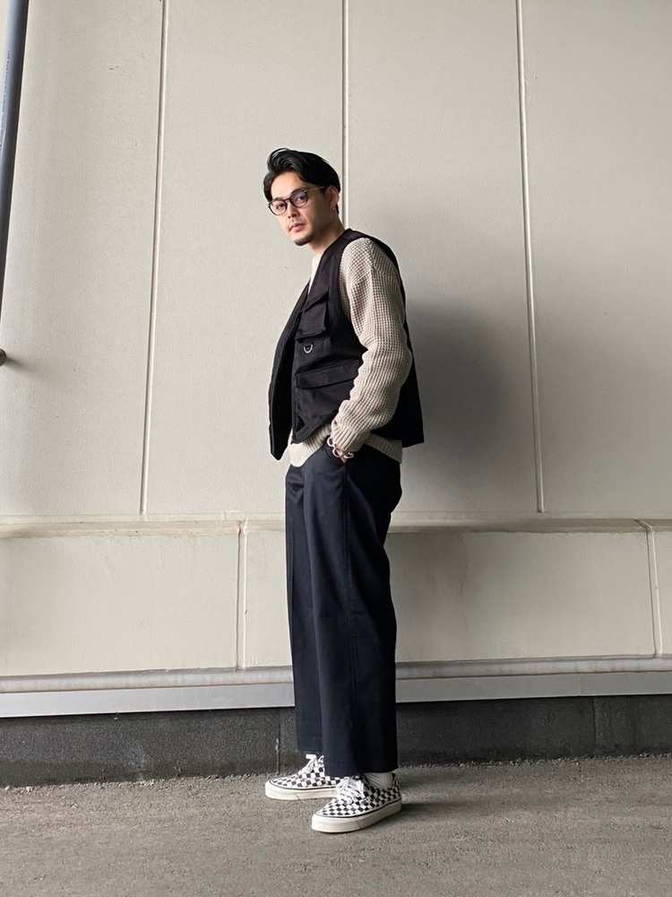 トレンドのフィッシングベストと黒チノパンを合わせ、大人カジュアルにまとめたコーデです。全体をモノトーンアイテムで揃えることで、フィッシングベストや格子柄のスニーカーを合わせても派手な印象になりません。ワイドシルエットの黒チノパンが、着こなしに大人の余裕を演出しています。