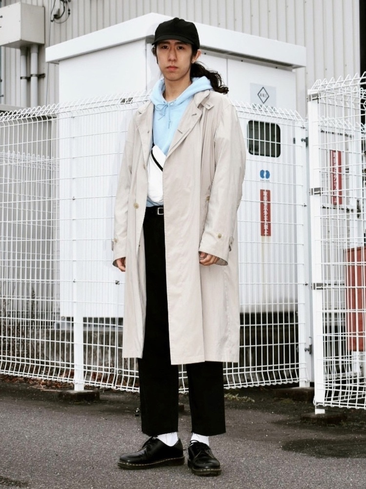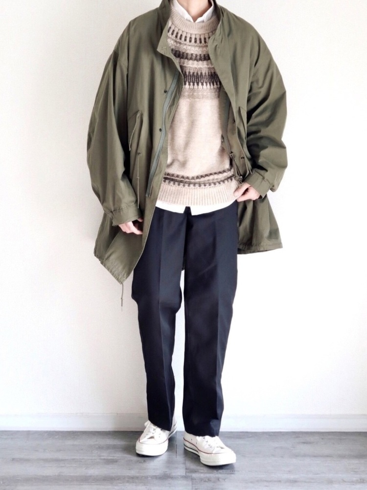 カーキのモッズコートやベージュニットなどと組み合わせたアースカラーコーデは、今のトレンドスタイルです。黒チノパンはワイドシルエットですが真ん中に1本タックが入っているため、ゆったりとしたモッズコートを羽織ってもスタイル良く履きこなせます。ニットトップスの中にシャツを重ね着し、襟を出すとセンスの良い着こなしになります。