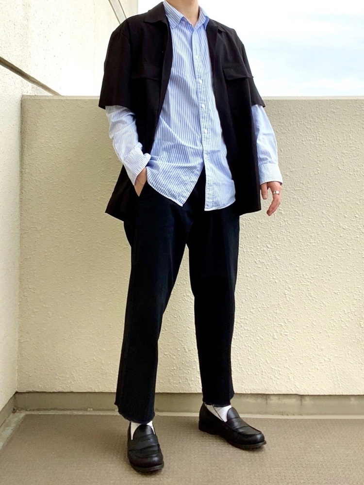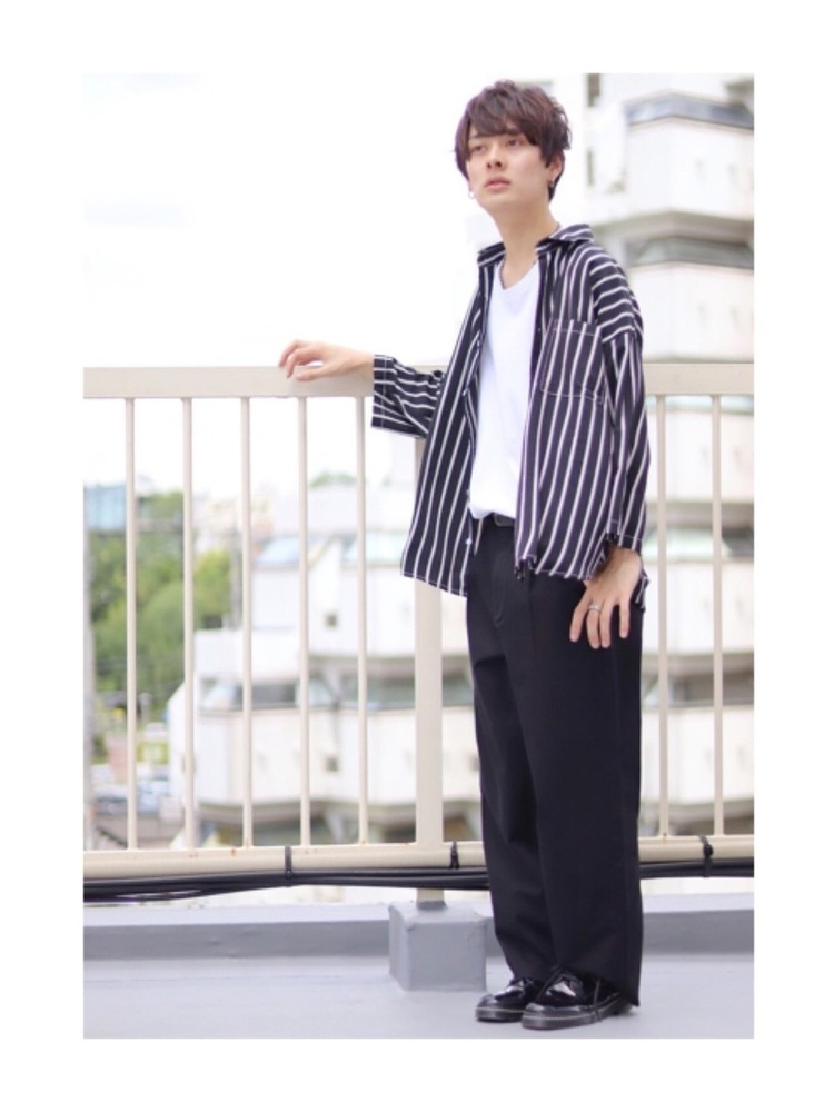 ゆったりとしたワイドシルエットの黒チノパンにビッグシャツを羽織った、ゆるコーデです。トップスの白Tもビッグサイズですが、タックインしていることや、シャツがストライプ柄なので野暮ったくなくスッキリと見せています。着こなしがゆるすぎないように、足元はドレスシューズで大人っぽさを加えればモダンな着こなしに。