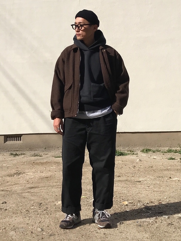 ブラウンとブラックの2色を中心にまとめたカジュアルコーデです。ブルゾンはショート丈を選ぶことで、ワイドな黒チノパンをバランスよく履きこなせています。トップスのパーカーの下からは白Tをレイヤードさせ、軽く裾を見せればブラウンとブラックのダークトーンコーデでも重たく見えません。