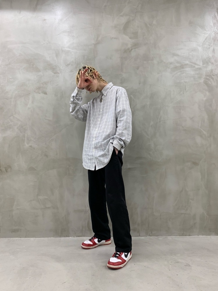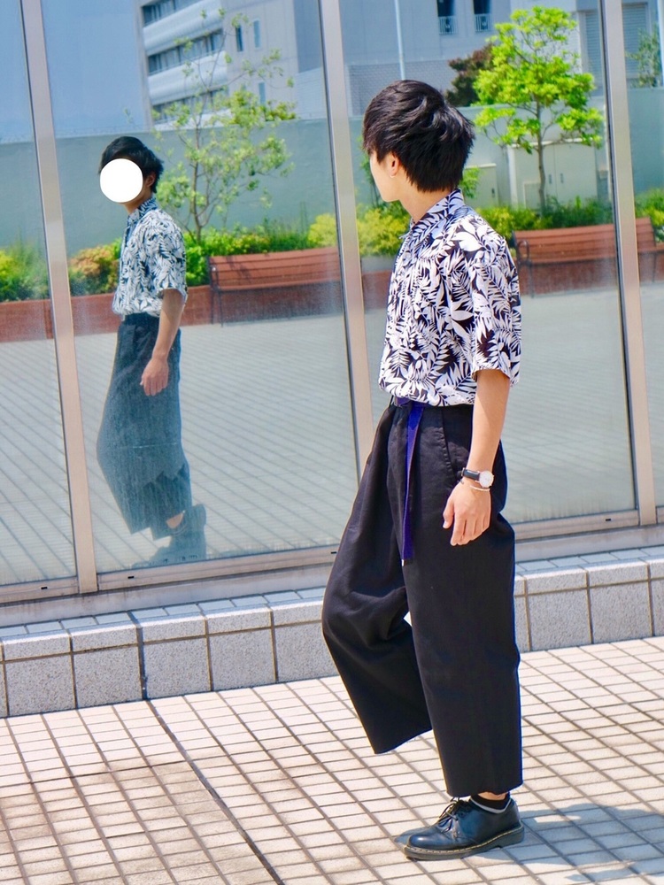 柄シャツはワイドチノパンにタックインし、メリハリを作りながら着るとおしゃれな仕上がりに。シャツの柄もチノパンと同じ黒なので、ブルーのベルトでさりげなく差し色をプラスしていることがこなれポイントです。ギブソンシューズにはショートソックスを合わせ、くるぶしが少し見えるよう工夫をすることで、足の細見え効果も生まれています。