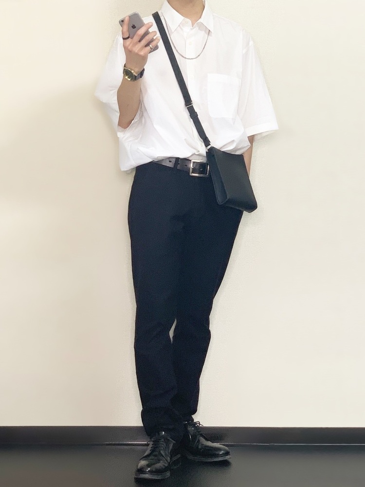 細身の黒チノパンと半袖シャツを合わせた、スマートカジュアルなメンズコーデです。トップスは5分袖の半袖シャツなのでラフにならず、ほんのりシックな印象に仕上がっています。