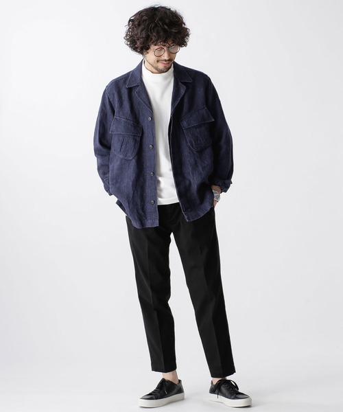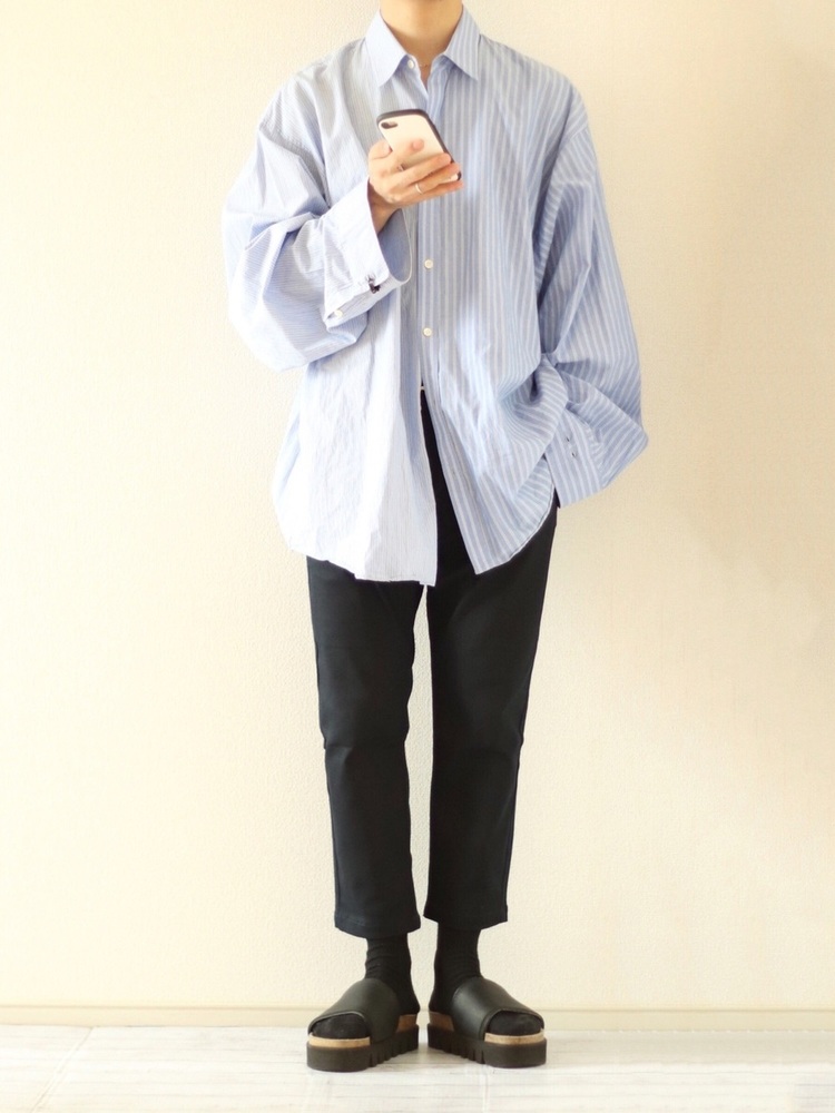 ゆったりとしたシャツと黒チノパンを合わせた、抜け感漂うコーデです。テーパードが効いたシルエットかつ裾が少し短くなっている黒チノパンなので、シャツをタックインしなくてもスマートに着こなせます。シューズはサンダルを合わせて、ラフさを加えていることがポイントです。