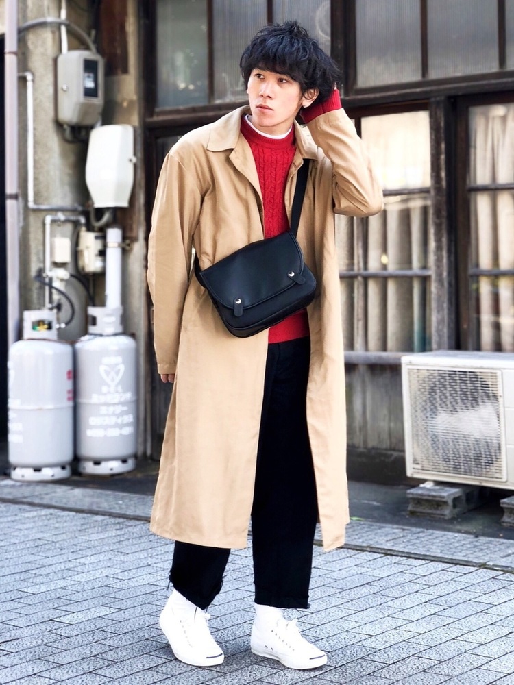 鮮やかな赤ニットがメリハリとおしゃれさを引き立てた、綺麗めカジュアルコーデです。白スニーカーがニットの赤とワイドチノパンの黒のコントラストを和らげ、清潔感のある着こなしに。膝より長いロング丈のステンカラーコートですが、ショルダーバックを短めに斜め掛けにしバランスを取っています。