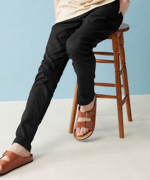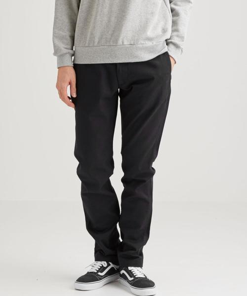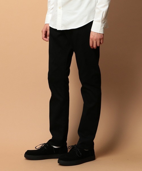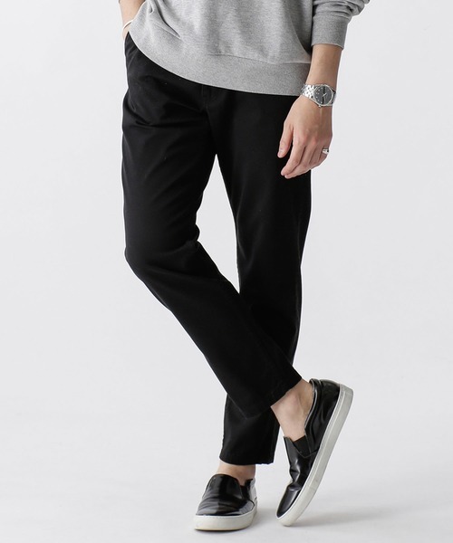 裾に向かって細身シルエットに作られた黒チノパンです。ベルト切り替えがない、1枚生地でウエストまで作られているため、腰回りもキツくなくシームレスに履けることが特徴です。