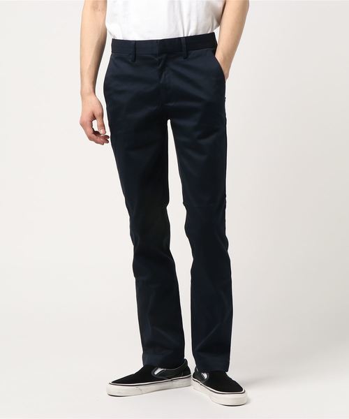 美脚を叶えてくれる、テーパードシルエットになった細身のチノパンです。細身ですが伸縮性もあるため、快適に履くことができます。シンプルなデザインとシルエットですが、ポケットの個数も多く機能性も抜群です。