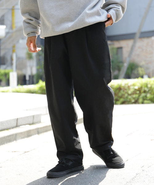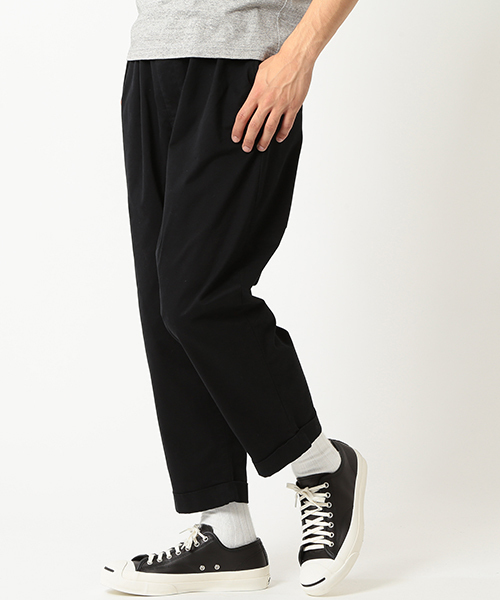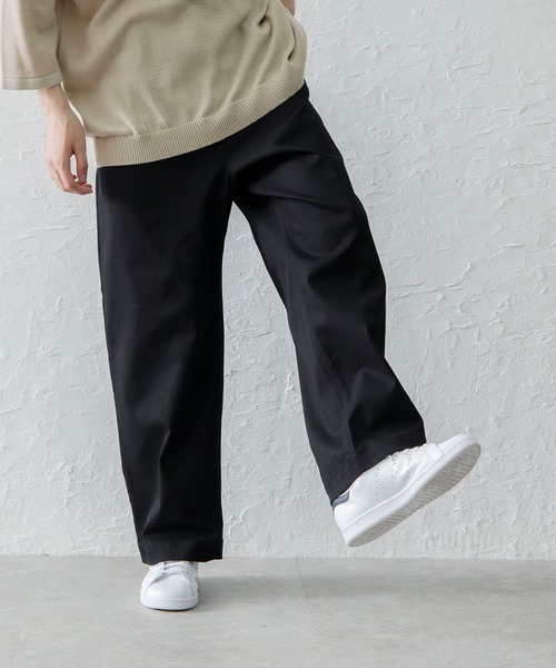 ウエスト部分にタックが入った黒のワイドチノパンです。腰回りがゆったりとしてテーパードも効いているため、着こなし全体のシルエットもバランスよく仕上げてくれます。