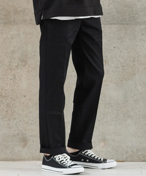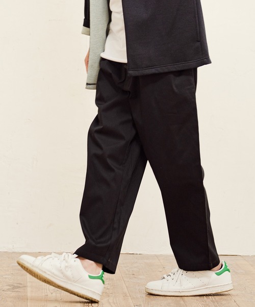汚れにくく、耐久性のあるツイル生地で作られた黒チノパンです。耐久性が高いため、色あせや色落ちしにくいものを探している人にピッタリです。また、裾までゆったりしているシルエットなので、ストリート系コーデともよくマッチします。