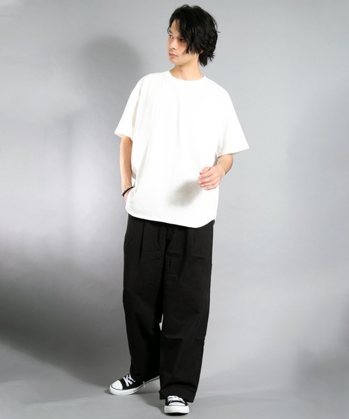 後ろから前へ斜めにタックが入っているため、ワイドチノパンの中でも個性を感じさせるデザインです。お尻まわりはコンパクトに、膝から下にかけてはストレートなシルエットになっています。