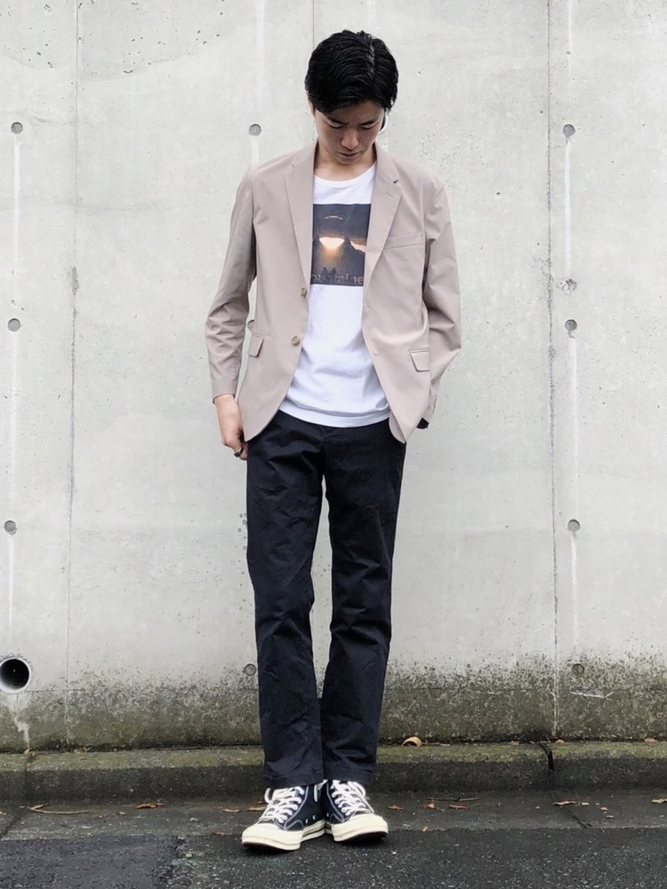 ブルゾンと細身のチノパンを黒で揃えたブラックコーデに、淡いベージュのトップスを合わせることで柔らかな着こなしに。白Tや白シャツに飽きた時にもオススメです。シューズもチノパンと同じ黒のローファーにすれば、下半身が黒1色でまとまるため足を長く細く見せる効果が期待できます。カジュアルすぎない大人な着こなしなので、デートの時にもバランスがいいスタイルです。