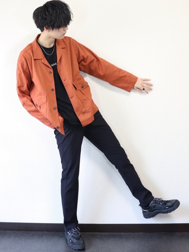 オレンジのリネンジャケットをコーデの差し色にした、カジュアルコーデです。チノパンをメインにトップスからシューズまで黒で統一しているので、全身が細身に引き締まって見える効果が出ています。明るいカラーを1つ投入するだけで、華やかかつメリハリのある着こなしに仕上がっています。