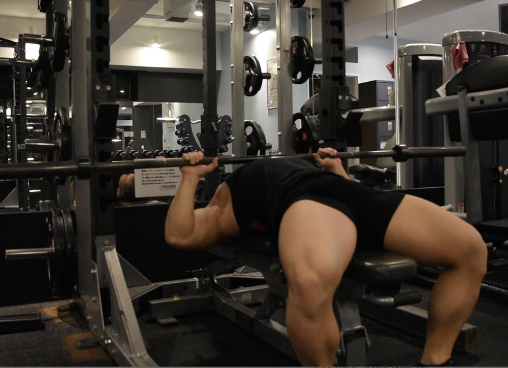 肩甲骨を寄せて胸を張り、バーを下ろします。バーを下ろす位置はみぞおちより少し上のあたりで、肘がバーベルの真下に来る位置になるよう意識してみてください。そして、肩甲骨の少し下あたりに手が入る程度の自然なブリッジの姿勢で真っすぐ上げていきましょう。