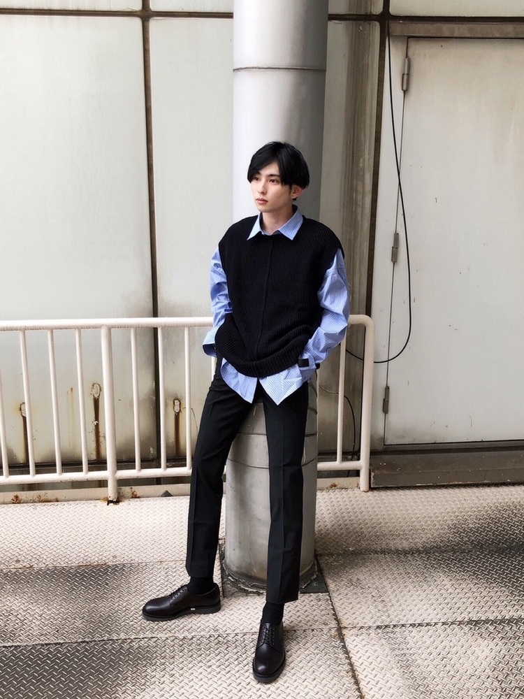 オーバーサイズシャツ1枚では肌寒い秋冬の季節は、ニットベストを重ね着することでスマートなメンズコーデが完成します。シャツ以外は全て黒のアイテムで統一することで、シャツのブルーがよく映えたメリハリのある着こなしに。