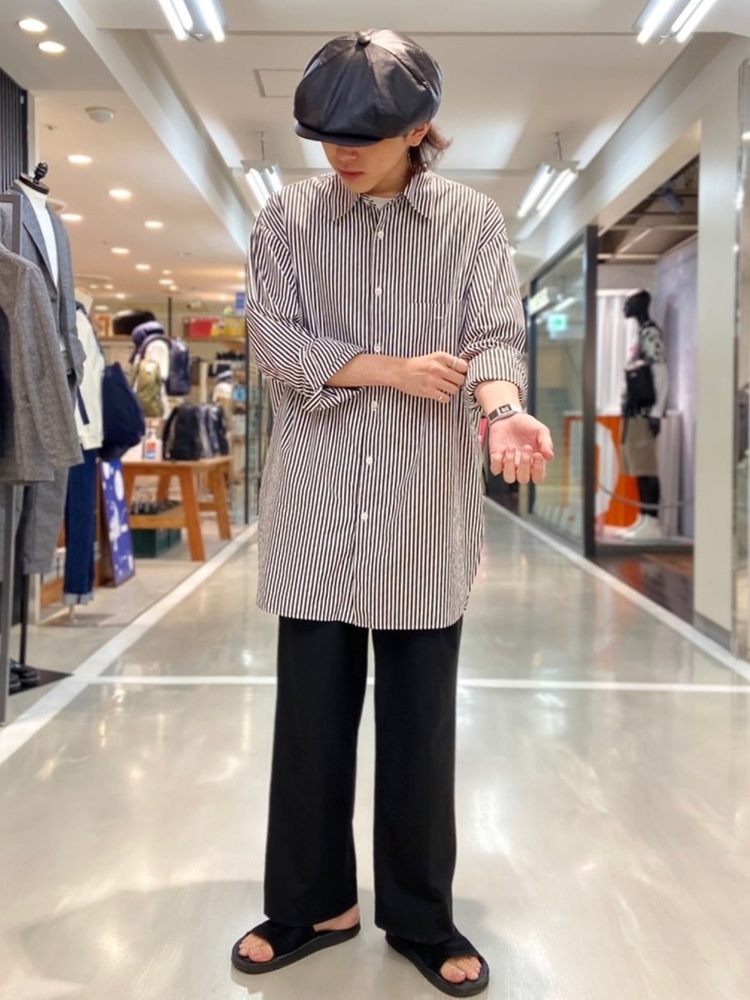 ロング丈のオーバーサイズシャツをトップスに合わせた、カジュアルなモダンコーデです。かっこいいレザー素材のキャスケット帽を小物に合わせつつ、足元はサンダルで外していることもポイント。ストライプ柄のオーバーサイズシャツなので、ゆったりめのワイドパンツに合わせても柄の効果で野暮ったく見えず、スタイルをスラッと見せることができています。