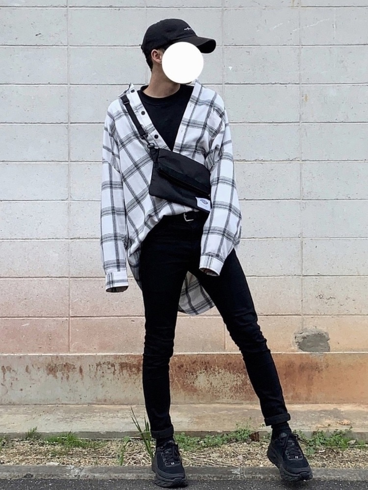 ロング丈のオーバーサイズシャツを前だけタックインして着こなした、ストリート系メンズコーデです。インナーのTシャツはパンツと同じ黒で統一し、チェック柄シャツを主役にしています。オーバーサイズシャツは軽く襟元を後ろにずらし、肩を落として着ることでよりこなれた雰囲気がアップ。