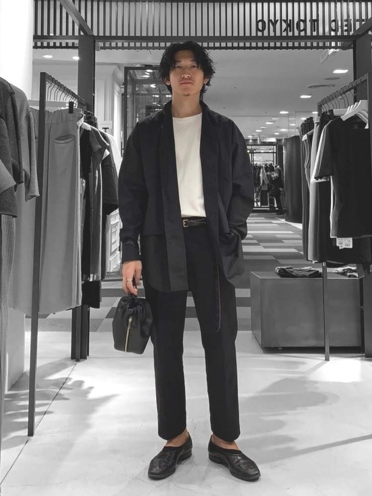 腰まで隠れるロング丈のオーバーサイズシャツをアウターとして着こなした、大人っぽいメンズコーデです。インナーの白Tはパンツにタックインし、腰回りを野暮ったく見せないことが大人のスマートさを演出するコツ。モノクロアイテムで全てまとめ、レザー素材のスリッポンでこなれたおしゃれさをプラスしています。