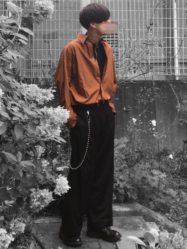 ゆったりとしたシルエットのワイドパンツと、オーバーサイズシャツをコンパクトにタックインしたメンズカジュアルコーデです。インナーはボトムスとリンクさせた黒Tを合わせているので、シャツのオレンジ系ブラウンが差し色になっています。