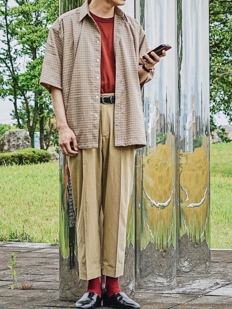 ベージュとブラウントーンで落ち着いた印象にまとめたメンズコーデです。半袖のオーバーサイズシャツはアウターとしてTシャツと重ね着し、足元にはスポックシューズを合わせればシンプルなアイテムを組み合わせたコーデも地味にならず、大人っぽいスマートな印象に仕上がります。