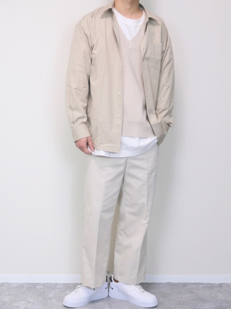 ホワイトやベージュの明るい2色でまとめた、爽やかなメンズコーデです。ライトベージュのオーバーサイズシャツは、ワントーンコーデにまとめることで地味にならず、女子ウケもいい着こなしに。Vネックベストに重ね着しレイヤードさせたインナーの白Tは、スニーカーと同じ白でリンクさせることもコーデに統一感を出すコツです。