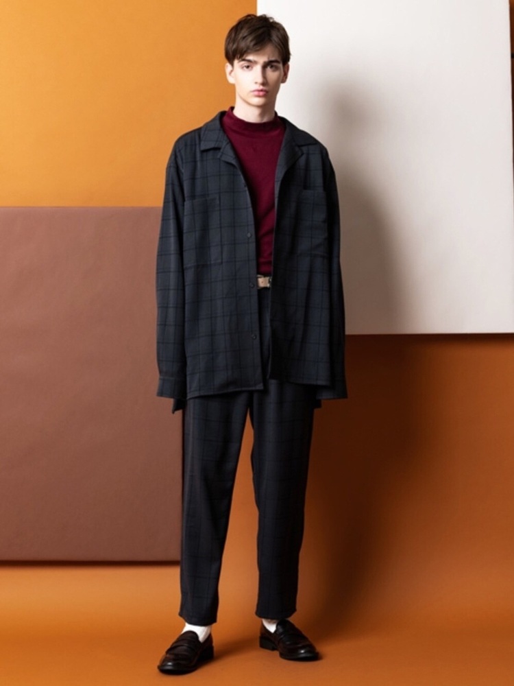 ロング丈のチェック柄オーバーサイズシャツは、初秋の軽いアウターとして使えばおしゃれで旬な着こなしに。インナーに合わせたワインレッドのTシャツが、ダークトーンコーデの差し色になっています。オーバーサイズシャツとテーパードパンツは、同じカラートーンで揃えることで縦長効果が出てスタイルアップ。