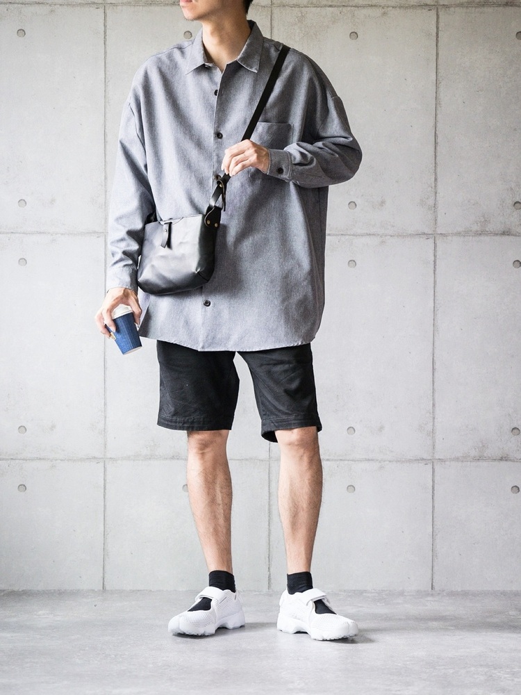 グレーのオーバーサイズシャツにメリハリをつけるように、小物やソックスにも黒を取り入れモノトーン配色にまとめています。