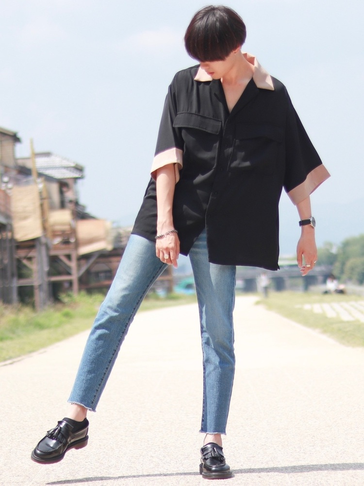 シンプルな着こなしのメンズコーデにアクセントを加えているのが、袖と襟がバイカラーデザインになったおしゃれな半袖オーバーサイズシャツ。黒1色だけだと重たく見えがちの半袖シャツでも、カラーが入ることでこなれ感漂う雰囲気に。ボトムスにはストレートのデニムパンツを合わせ、細身のシルエットにまとめることでスタイルアップを叶えています。