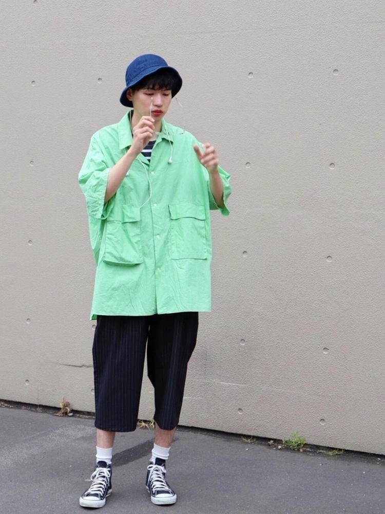 ネオンカラーのオーバーサイズシャツは、7分丈のワイドパンツと合わせればストリート系の着こなしに。色味にインパクトがあるシャツなので、ボトムスやシューズはモノクロで統一。丈が長めのソックスで白を効かせ、ゆるいシルエットのコーデでも清潔感をプラスしていることもおしゃれな雰囲気を高めています。